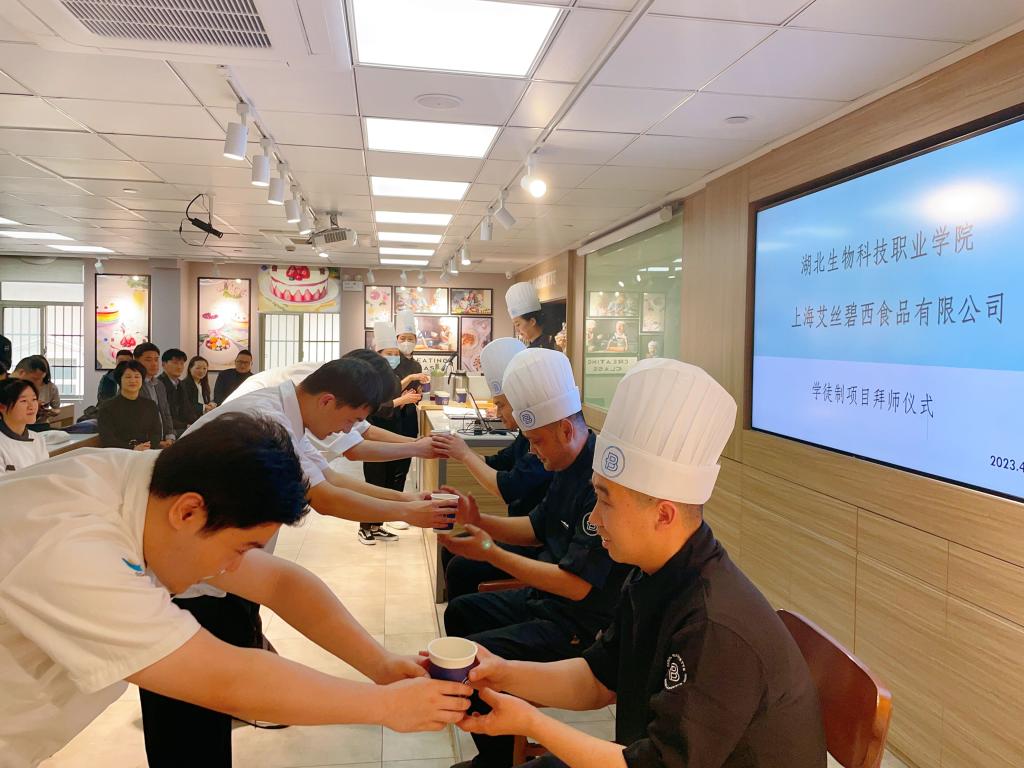 4月25日的现代学徒制拜师仪式上,艾丝碧西投资公司总经理秋渊胜对到访领导表示了热烈欢迎,介绍了公司的发展历程,市场发展情况,表达了参与好、落实好现代学徒制项目的决心与期待。随后,26名学生学徒们向企业师傅行拜师礼,正式确定师徒关系。