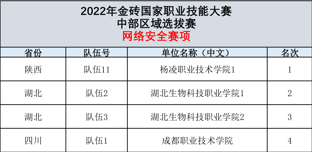 10月13日,2022年金砖国家职业技能大赛“网络安全”赛项中部赛区选拔赛、圆满落幕。我院信息安全应用技术专业的候嘉俊、李伟、蒲瑞奇、张俊熙、代子熊、丁鹏等学生组成的2支代表队分别获得分区比赛湖北省的1、2名,中部赛区的第二和第三名。最终成功晋级2022年金砖国家技能大赛全国总决赛。