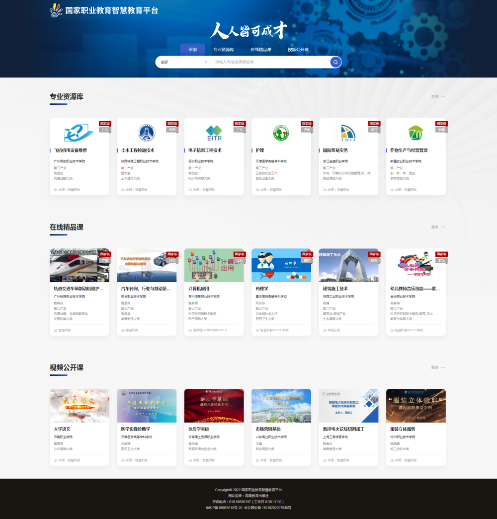 国家智慧教育平台包括国家中小学智慧教育平台、国家职业教育智慧教育平台、国家高等教育智慧教育平台和国家24365大学生就业服务平台四个子平台。其中的国家职业教育智慧教育平台分为专业资源库、在线视频课、视频公开课三个模块,涵盖了第一、第二、第三产业的各类不同专业教育资源,所有资源均向社会公开。