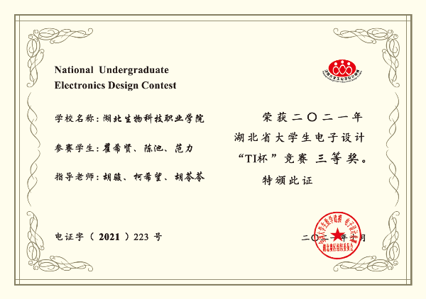 全国大学生电子设计竞赛是由教育部和工业和信息化部于1994年共同发起的大学生学科竞赛,至今有27年的历史,其目的在于推动高等学校进行信息与电子类学科课程体系和课程内容的改革,提高参赛学生针对实际问题进行电子设计制作的能力。2021年电赛共有1117个高等院校(含高职)的19735个学生队伍,近6万名大学生参加,竞争异常激烈。信息传媒学院物联网专业学生参加全国大学生电子设计竞赛。学生根据赛题在四天三夜共84小时内,设计制做出电子产品提交组委会专家组集中测评,最终获省赛三等奖。