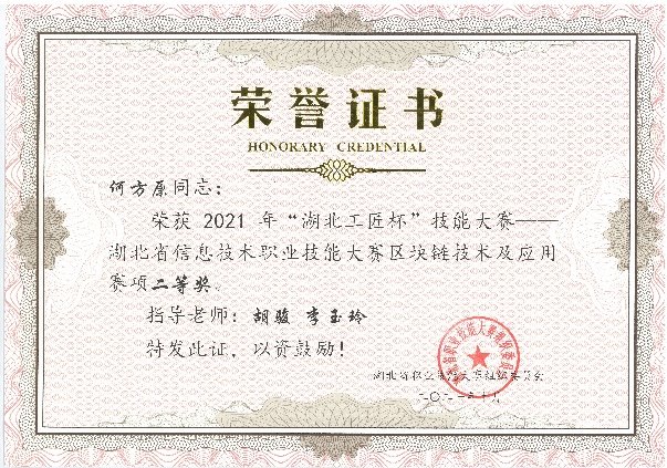 湖北工匠杯是由湖北省人力资源和社会保障厅主办,开展省级一类大赛25项,二类竞赛23项。一类大赛,对各职业(工种)决赛前3名的选手,经核准后,授予“湖北省技术能手”荣誉;二类竞赛,对各职业(工种)决赛第1名的选手,经核准后,授予“湖北省技术能手”荣誉。2021年10月至12月,信息传媒学院共参加“湖北工匠杯”商务软件解决方案、移动应用开发、区块链技术、网络安全技术、工业互联网技术、测土施肥信息技术、5G+MR资源开发、信息通信信息化系统管理员、互联网信息审核员等九个赛项获得一等奖8个,二等奖13个,三等奖9个。根据“湖北工匠杯”奖励办法,教师何方原、柯希望及学生叶志浩,将获得“湖北省技术能手”称号。
