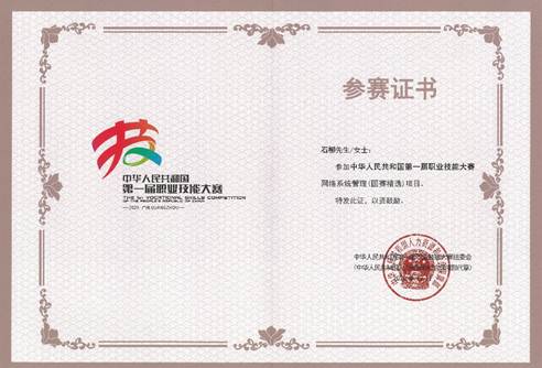 12月10日至12月13日,中华人民共和国第一届职业技能大赛,在广东省举办。我校石柳老师代表湖北省参加网络系统管理项目比赛,在经过三天的激烈角逐,取得第6名优异成绩,获优胜奖表彰。